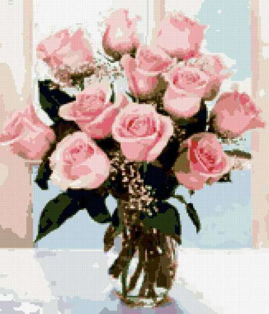 Ориентировочно так, схема вышивки «Розы на окне», созданная автором marrpu, будет выглядеть при отшиве на канве. Размер данной вышивки равен 163x190 крестов, при этом используется 29 цветов. Ключевые слова, по которым можно найти эту схему: цветы, букет, ваза, розы, окно. Также, вы можете взглянуть на оригинальную картинку, соответствующую данной схеме вышивки.