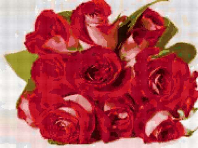 Ориентировочно так, схема вышивки «Розы», созданная автором vampirlady2009, будет выглядеть при отшиве на канве. Размер данной вышивки равен 183x137 крестов, при этом используется 41 цветов. Ключевые слова, по которым можно найти эту схему: роза, розы, букет цветов, цветы, красный, открытка, 8 марта . Также, вы можете взглянуть на оригинальную картинку, соответствующую данной схеме вышивки.