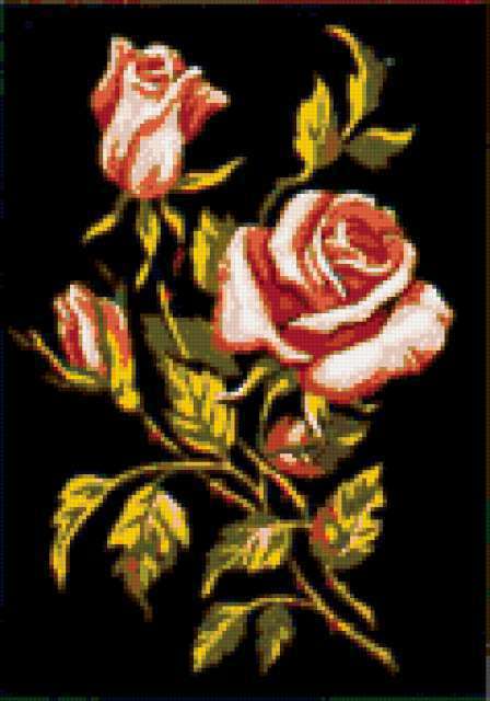 Ориентировочно так, схема вышивки «Розы», созданная автором VA903M, будет выглядеть при отшиве на канве. Размер данной вышивки равен 119x170 крестов, при этом используется 30 цветов. Ключевые слова, по которым можно найти эту схему: цветы, розы, пано. Также, вы можете взглянуть на оригинальную картинку, соответствующую данной схеме вышивки.