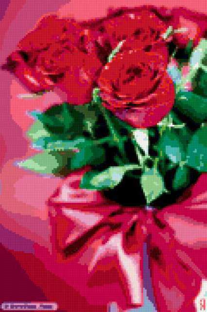 Ориентировочно так, схема вышивки «Розы», созданная автором polovinkamarinka, будет выглядеть при отшиве на канве. Размер данной вышивки равен 120x180 крестов, при этом используется 50 цветов. Ключевые слова, по которым можно найти эту схему: букет. Также, вы можете взглянуть на оригинальную картинку, соответствующую данной схеме вышивки.