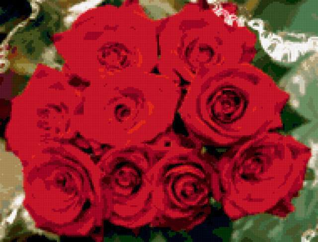 Ориентировочно так, схема вышивки «Розы», созданная автором malkinaiv, будет выглядеть при отшиве на канве. Размер данной вышивки равен 190x145 крестов, при этом используется 54 цветов. Ключевые слова, по которым можно найти эту схему: розы, цветы, букет. Также, вы можете взглянуть на оригинальную картинку, соответствующую данной схеме вышивки.