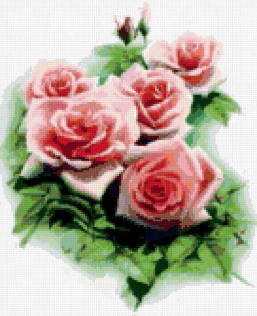 Ориентировочно так, схема вышивки «Розы», созданная автором poltanya, будет выглядеть при отшиве на канве. Размер данной вышивки равен 136x167 крестов, при этом используется 43 цветов. Ключевые слова, по которым можно найти эту схему: розы, роза, цветы, панно, розочки, картина, флора. Также, вы можете взглянуть на оригинальную картинку, соответствующую данной схеме вышивки.