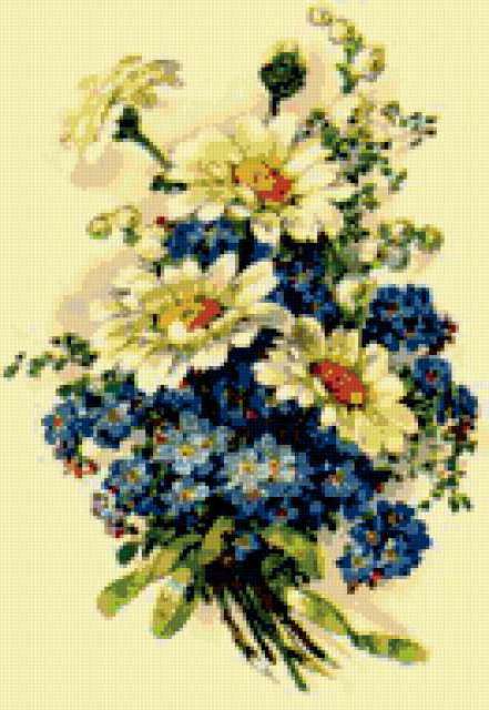 Ориентировочно так, схема вышивки «Ромашки и незабудки», созданная автором poltanya, будет выглядеть при отшиве на канве. Размер данной вышивки равен 131x190 крестов, при этом используется 47 цветов. Ключевые слова, по которым можно найти эту схему: незабудки, незабудка, ромашки, ромашка, букет, цветы, картина, флора, красота. Также, вы можете взглянуть на оригинальную картинку, соответствующую данной схеме вышивки.