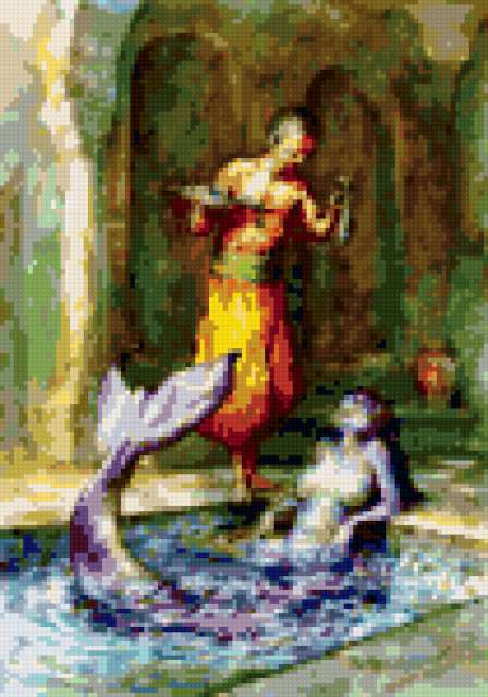 Ориентировочно так, схема вышивки «Русалка 2», созданная автором ufktxrf, будет выглядеть при отшиве на канве. Размер данной вышивки равен 105x150 крестов, при этом используется 54 цветов. Ключевые слова, по которым можно найти эту схему: русалка, девушка, красавица, замок, дворец, слуга, раб, сказка, фентези. Также, вы можете взглянуть на оригинальную картинку, соответствующую данной схеме вышивки.