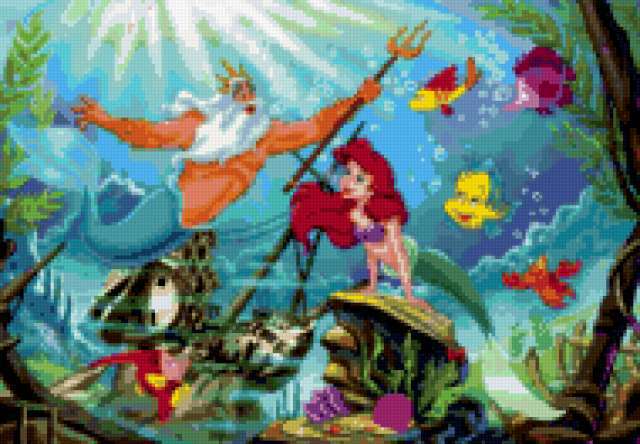 Ориентировочно так, схема вышивки «Русалочка 2», созданная автором avevstigneeva, будет выглядеть при отшиве на канве. Размер данной вышивки равен 190x132 крестов, при этом используется 84 цветов. Ключевые слова, по которым можно найти эту схему: сказка, детям. Также, вы можете взглянуть на оригинальную картинку, соответствующую данной схеме вышивки.