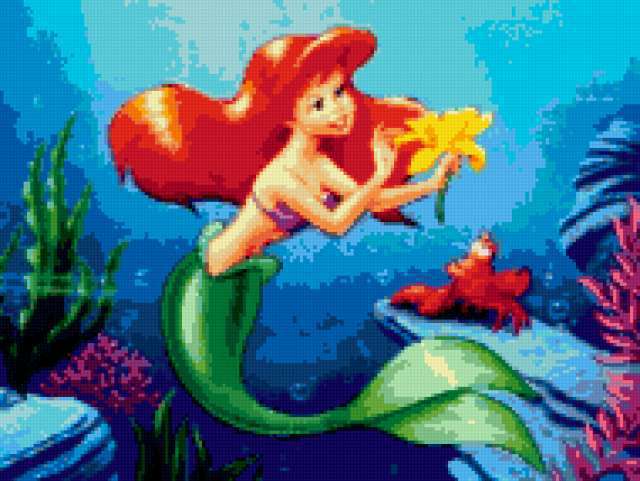 Ориентировочно так, схема вышивки «Русалочка», созданная автором Melisenta, будет выглядеть при отшиве на канве. Размер данной вышивки равен 190x143 крестов, при этом используется 56 цветов. Ключевые слова, по которым можно найти эту схему: сказка, детям, дисней, мультик. Также, вы можете взглянуть на оригинальную картинку, соответствующую данной схеме вышивки.