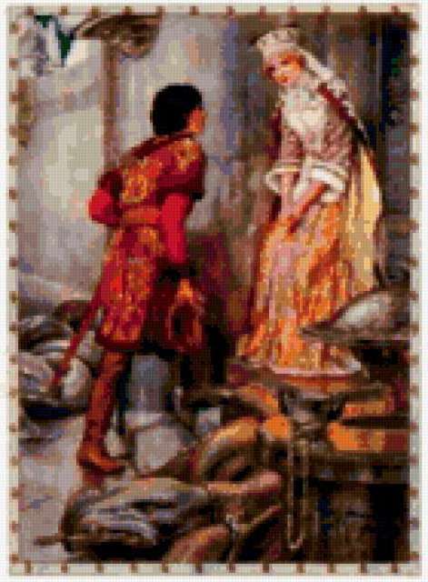Ориентировочно так, схема вышивки «Русские сказки», созданная автором Melisenta, будет выглядеть при отшиве на канве. Размер данной вышивки равен 140x190 крестов, при этом используется 71 цветов. Ключевые слова, по которым можно найти эту схему: сказка, детям, люди, картина, царевна. Также, вы можете взглянуть на оригинальную картинку, соответствующую данной схеме вышивки.
