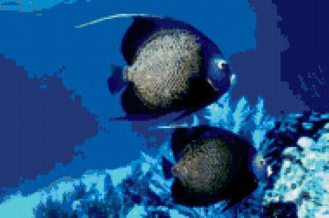 Ориентировочно так, схема вышивки «Рыбы», созданная автором Ilena, будет выглядеть при отшиве на канве. Размер данной вышивки равен 190x126 крестов, при этом используется 43 цветов. Ключевые слова, по которым можно найти эту схему: море.рыбы. Также, вы можете взглянуть на оригинальную картинку, соответствующую данной схеме вышивки.