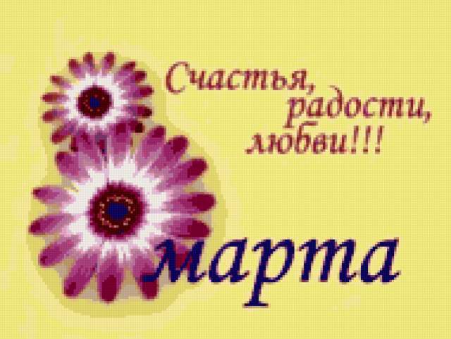 Ориентировочно так, схема вышивки «С 8 марта», созданная автором -tatka-, будет выглядеть при отшиве на канве. Размер данной вышивки равен 190x143 крестов, при этом используется 26 цветов. Ключевые слова, по которым можно найти эту схему: цветы, 8 марта. Также, вы можете взглянуть на оригинальную картинку, соответствующую данной схеме вышивки.