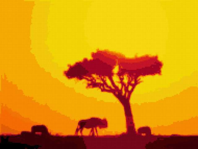 Ориентировочно так, схема вышивки «Саванна», созданная автором ksuhasun, будет выглядеть при отшиве на канве. Размер данной вышивки равен 190x143 крестов, при этом используется 20 цветов. Ключевые слова, по которым можно найти эту схему: саванна, африка, солнце . Также, вы можете взглянуть на оригинальную картинку, соответствующую данной схеме вышивки.