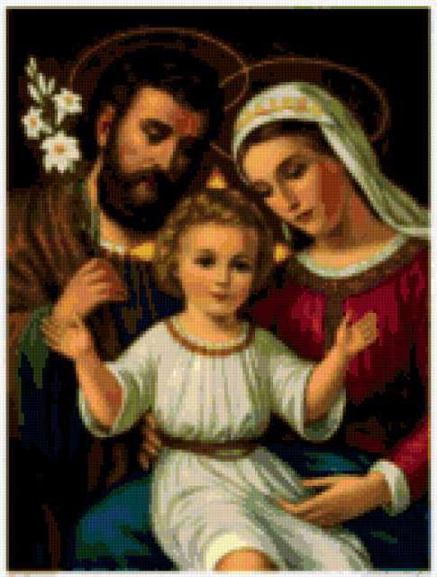 Ориентировочно так, схема вышивки «Святое семейство», созданная автором torik, будет выглядеть при отшиве на канве. Размер данной вышивки равен 144x190 крестов, при этом используется 70 цветов. Ключевые слова, по которым можно найти эту схему: религия. Также, вы можете взглянуть на оригинальную картинку, соответствующую данной схеме вышивки.