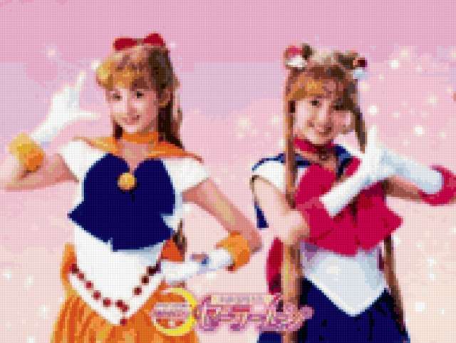 Ориентировочно так, схема вышивки «Сейлор Венера и Сейлор Мун», созданная автором AuraDomo, будет выглядеть при отшиве на канве. Размер данной вышивки равен 190x143 крестов, при этом используется 72 цветов. Ключевые слова, по которым можно найти эту схему: сейлор венера, сейлор мун, минако аино, усаги цукино, коматсу ауака, саваи мию. Также, вы можете взглянуть на оригинальную картинку, соответствующую данной схеме вышивки.