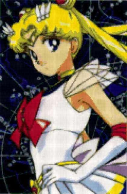 Ориентировочно так, схема вышивки «Сейлор Мун», созданная автором AuraDomo, будет выглядеть при отшиве на канве. Размер данной вышивки равен 120x182 крестов, при этом используется 76 цветов. Ключевые слова, по которым можно найти эту схему: сейлор мун, усаги цукино. Также, вы можете взглянуть на оригинальную картинку, соответствующую данной схеме вышивки.