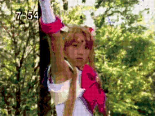 Ориентировочно так, схема вышивки «Сейлор Мун», созданная автором AuraDomo, будет выглядеть при отшиве на канве. Размер данной вышивки равен 190x143 крестов, при этом используется 76 цветов. Ключевые слова, по которым можно найти эту схему: сейлор мун, усаги цукино, саваи мию. Также, вы можете взглянуть на оригинальную картинку, соответствующую данной схеме вышивки.