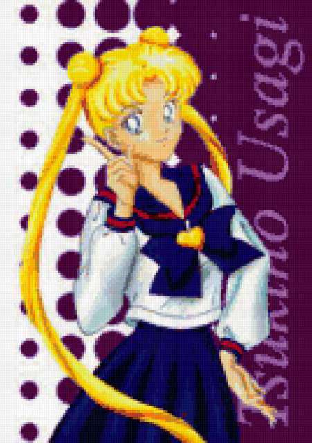 Ориентировочно так, схема вышивки «Сейлор Мун», созданная автором AuraDomo, будет выглядеть при отшиве на канве. Размер данной вышивки равен 134x190 крестов, при этом используется 60 цветов. Ключевые слова, по которым можно найти эту схему: сейлор мун, усаги цукино. Также, вы можете взглянуть на оригинальную картинку, соответствующую данной схеме вышивки.