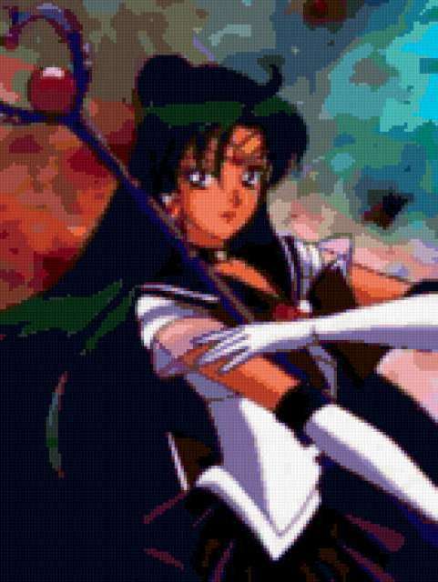 Ориентировочно так, схема вышивки «Сейлор Плутон», созданная автором Karel, будет выглядеть при отшиве на канве. Размер данной вышивки равен 143x190 крестов, при этом используется 57 цветов. Ключевые слова, по которым можно найти эту схему: сейлор мун, аниме. Также, вы можете взглянуть на оригинальную картинку, соответствующую данной схеме вышивки.