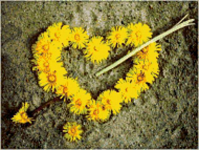 Ориентировочно так, схема вышивки «Сердечко», созданная автором Svetla_Nochka, будет выглядеть при отшиве на канве. Размер данной вышивки равен 190x143 крестов, при этом используется 46 цветов. Ключевые слова, по которым можно найти эту схему: любовь, чувства, сердце, орган, цветы, flowers, одуванчики, одуванчик, стрелы. Также, вы можете взглянуть на оригинальную картинку, соответствующую данной схеме вышивки.