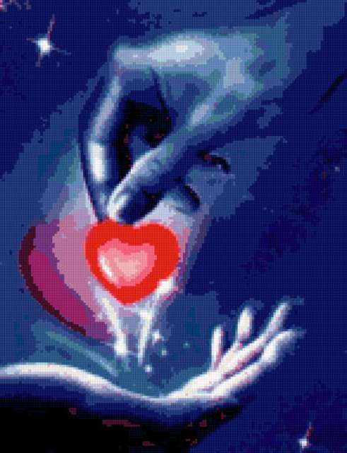 Ориентировочно так, схема вышивки «Сердце любви», созданная автором VA903M, будет выглядеть при отшиве на канве. Размер данной вышивки равен 146x190 крестов, при этом используется 38 цветов. Ключевые слова, по которым можно найти эту схему: руки, сердце, любовь. Также, вы можете взглянуть на оригинальную картинку, соответствующую данной схеме вышивки.