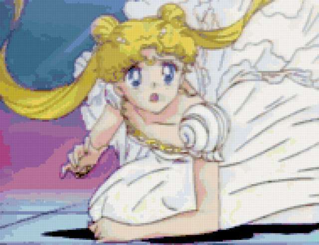 Ориентировочно так, схема вышивки «Серенити», созданная автором AuraDomo, будет выглядеть при отшиве на канве. Размер данной вышивки равен 189x145 крестов, при этом используется 73 цветов. Ключевые слова, по которым можно найти эту схему: серенити, аниме, сейлор мун, усаги цукино. Также, вы можете взглянуть на оригинальную картинку, соответствующую данной схеме вышивки.