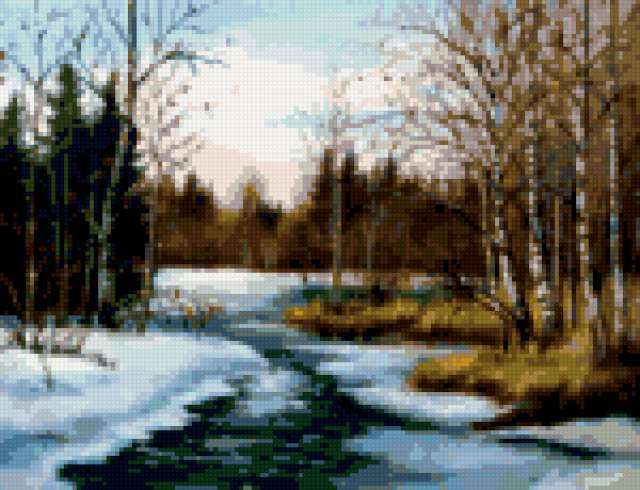 Ориентировочно так, схема вышивки «Серия ВЕСНА », созданная автором Helga-Darina, будет выглядеть при отшиве на канве. Размер данной вышивки равен 150x115 крестов, при этом используется 48 цветов. Ключевые слова, по которым можно найти эту схему: картина, живопись, природа, зима, весна, лес, проталина, дерево, деревья, береза, березы. Также, вы можете взглянуть на оригинальную картинку, соответствующую данной схеме вышивки.