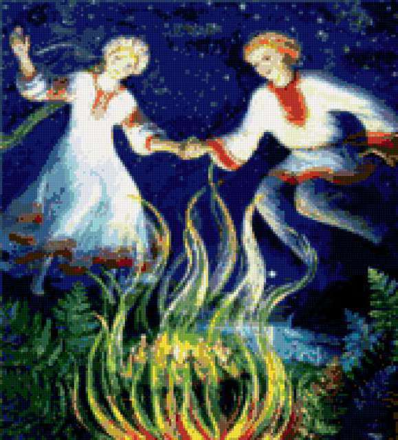 Ориентировочно так, схема вышивки «Серия славяне», созданная автором ufktxrf, будет выглядеть при отшиве на канве. Размер данной вышивки равен 172x190 крестов, при этом используется 48 цветов. Ключевые слова, по которым можно найти эту схему: славяне, костёр, купала, огонь. Также, вы можете взглянуть на оригинальную картинку, соответствующую данной схеме вышивки.