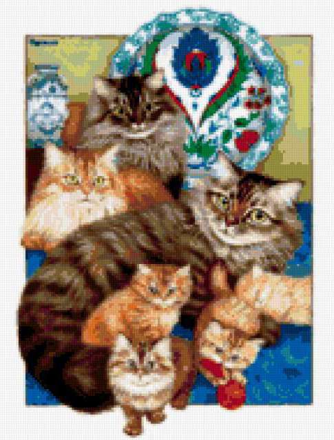 Ориентировочно так, схема вышивки «Серия - "Кошачья семья"», созданная автором Sineglazka, будет выглядеть при отшиве на канве. Размер данной вышивки равен 144x190 крестов, при этом используется 66 цветов. Ключевые слова, по которым можно найти эту схему: животные, кошка, котята, семья. Также, вы можете взглянуть на оригинальную картинку, соответствующую данной схеме вышивки.