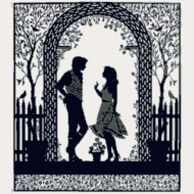 Ориентировочно так, схема вышивки «Силуэт», созданная автором smorodina2410, будет выглядеть при отшиве на канве. Размер данной вышивки равен 190x190 крестов, при этом используется 5 цветов. Ключевые слова, по которым можно найти эту схему: люди, природа. Также, вы можете взглянуть на оригинальную картинку, соответствующую данной схеме вышивки.