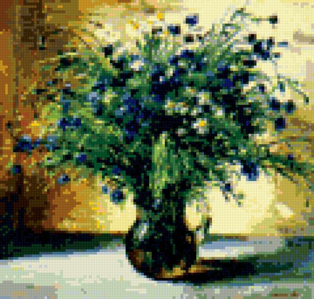 Ориентировочно так, схема вышивки «Синий букет», созданная автором irivik, будет выглядеть при отшиве на канве. Размер данной вышивки равен 120x114 крестов, при этом используется 48 цветов. Ключевые слова, по которым можно найти эту схему: цветы, васильки, букет. Также, вы можете взглянуть на оригинальную картинку, соответствующую данной схеме вышивки.