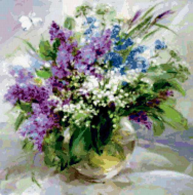 Ориентировочно так, схема вышивки «Сирень и ландыши», созданная автором Harmful_Hedgehog, будет выглядеть при отшиве на канве. Размер данной вышивки равен 188x190 крестов, при этом используется 82 цветов. Ключевые слова, по которым можно найти эту схему: цветы, роза, букет, натюрморт, полевые цветы, сирень, ландыши. Также, вы можете взглянуть на оригинальную картинку, соответствующую данной схеме вышивки.