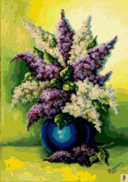 Ориентировочно так, схема вышивки «Сирень», созданная автором vampirlady2009, будет выглядеть при отшиве на канве. Размер данной вышивки равен 134x190 крестов, при этом используется 69 цветов. Ключевые слова, по которым можно найти эту схему: сирень, цветы, 8 марта. Также, вы можете взглянуть на оригинальную картинку, соответствующую данной схеме вышивки.