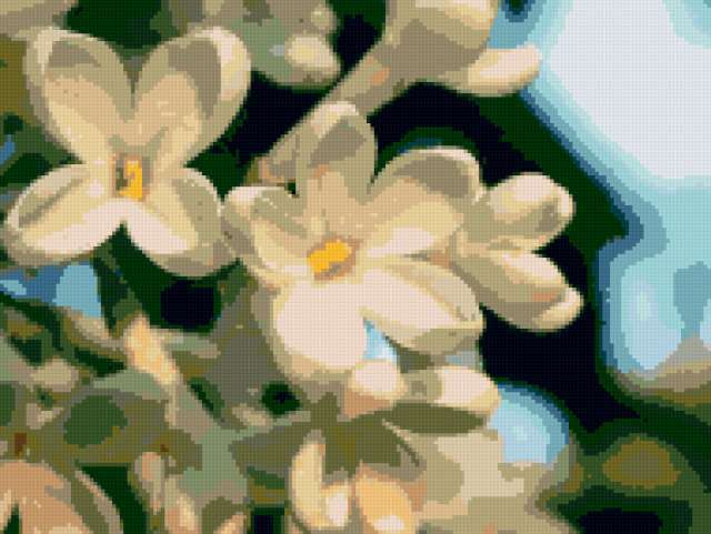 Ориентировочно так, схема вышивки «Сирень», созданная автором _KostyaNika_, будет выглядеть при отшиве на канве. Размер данной вышивки равен 190x143 крестов, при этом используется 27 цветов. Ключевые слова, по которым можно найти эту схему: сирень, ветка, цветок. Также, вы можете взглянуть на оригинальную картинку, соответствующую данной схеме вышивки.