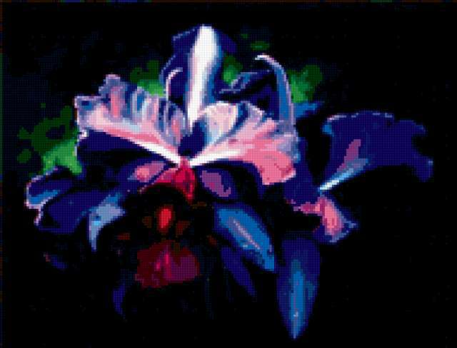Ориентировочно так, схема вышивки «Сияние фиолетового», созданная автором Svetlisha, будет выглядеть при отшиве на канве. Размер данной вышивки равен 190x145 крестов, при этом используется 49 цветов. Ключевые слова, по которым можно найти эту схему: цветы, орхидеи. Также, вы можете взглянуть на оригинальную картинку, соответствующую данной схеме вышивки.