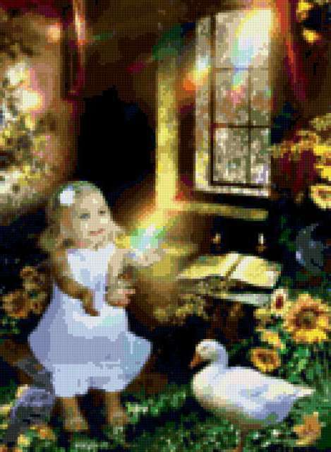 Ориентировочно так, схема вышивки «Сказка», созданная автором lilya0505, будет выглядеть при отшиве на канве. Размер данной вышивки равен 132x180 крестов, при этом используется 71 цветов. К несчастью, автор не назначил для схемы ключевые слова. Также, вы можете взглянуть на оригинальную картинку, соответствующую данной схеме вышивки.