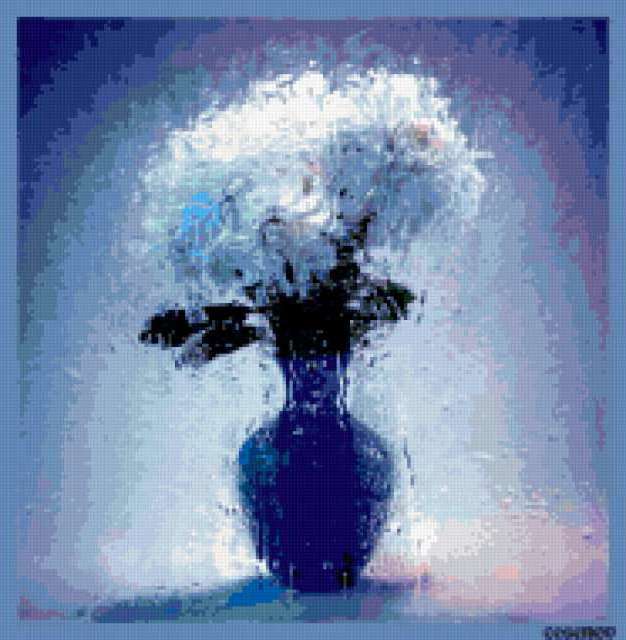 Ориентировочно так, схема вышивки «Сквозь стену дождя», созданная автором Ainka, будет выглядеть при отшиве на канве. Размер данной вышивки равен 186x190 крестов, при этом используется 52 цветов. Ключевые слова, по которым можно найти эту схему: натюрморт, цветы. Также, вы можете взглянуть на оригинальную картинку, соответствующую данной схеме вышивки.