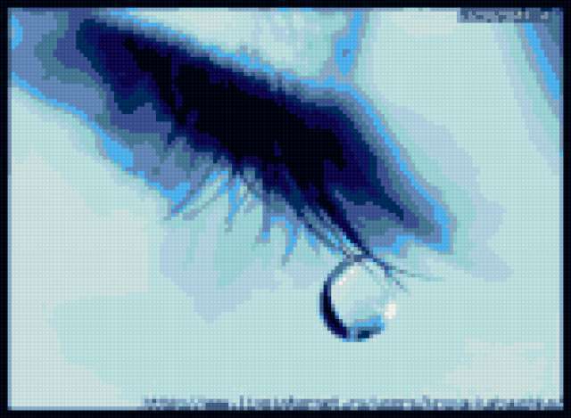Ориентировочно так, схема вышивки «Слеза», созданная автором xeufq21, будет выглядеть при отшиве на канве. Размер данной вышивки равен 150x110 крестов, при этом используется 19 цветов. Ключевые слова, по которым можно найти эту схему: глаза, печаль, слезы. Также, вы можете взглянуть на оригинальную картинку, соответствующую данной схеме вышивки.