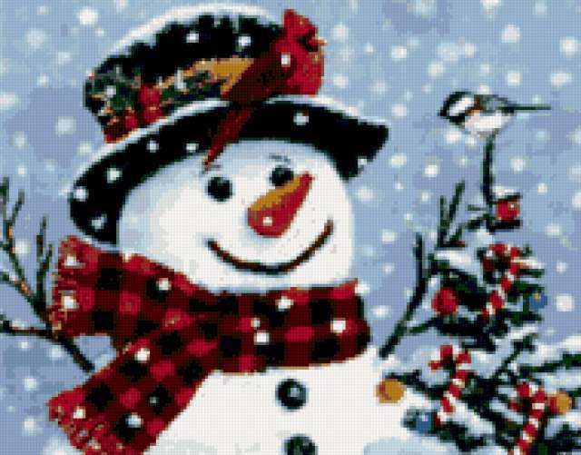 Ориентировочно так, схема вышивки «Снеговик и птички», созданная автором poltanya, будет выглядеть при отшиве на канве. Размер данной вышивки равен 190x149 крестов, при этом используется 35 цветов. Ключевые слова, по которым можно найти эту схему: снеговики, снеговик, зима, снежинки, детские сюжеты, новый год, рождество, открытка, детки, птички. Также, вы можете взглянуть на оригинальную картинку, соответствующую данной схеме вышивки.