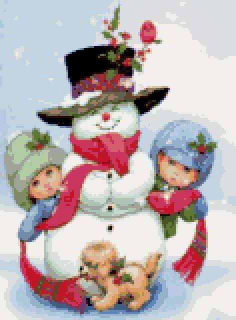 Ориентировочно так, схема вышивки «Снеговик», созданная автором poltanya, будет выглядеть при отшиве на канве. Размер данной вышивки равен 118x160 крестов, при этом используется 49 цветов. Ключевые слова, по которым можно найти эту схему: снеговики, снеговик, зима, снежинки, детские сюжеты, новый год, рождество, открытка, детки. Также, вы можете взглянуть на оригинальную картинку, соответствующую данной схеме вышивки.