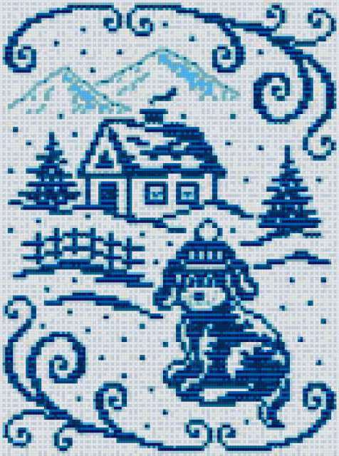 Ориентировочно так, схема вышивки «Снежный пёс», созданная автором poltanya, будет выглядеть при отшиве на канве. Размер данной вышивки равен 131x176 крестов, при этом используется 15 цветов. Ключевые слова, по которым можно найти эту схему: пейзаж, зима, зимняя сказка, зимняя картина, узоры, снег, снежинки, собака, домики, домик, ёлки, горы, природа, красота. Также, вы можете взглянуть на оригинальную картинку, соответствующую данной схеме вышивки.