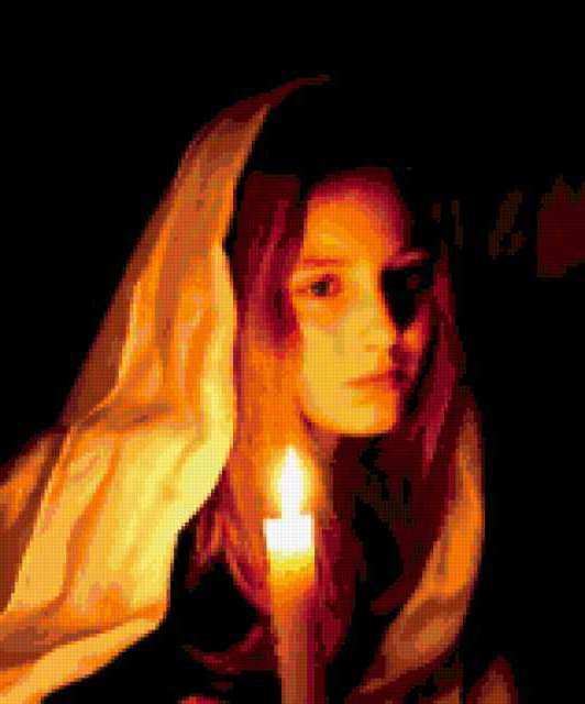 Ориентировочно так, схема вышивки «Со свечой», созданная автором 1978swetik, будет выглядеть при отшиве на канве. Размер данной вышивки равен 158x190 крестов, при этом используется 48 цветов. Ключевые слова, по которым можно найти эту схему: свеча, девушка, ночь. Также, вы можете взглянуть на оригинальную картинку, соответствующую данной схеме вышивки.