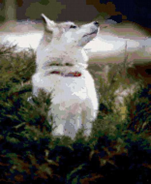 Ориентировочно так, схема вышивки «Собака 9», созданная автором annyshka_79_79, будет выглядеть при отшиве на канве. Размер данной вышивки равен 156x190 крестов, при этом используется 40 цветов. Ключевые слова, по которым можно найти эту схему: акита-ину, пес. Также, вы можете взглянуть на оригинальную картинку, соответствующую данной схеме вышивки.