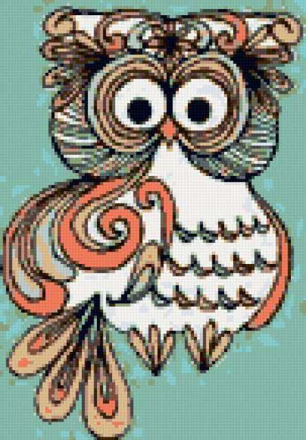 Ориентировочно так, схема вышивки «Сова», созданная автором poltanya, будет выглядеть при отшиве на канве. Размер данной вышивки равен 101x145 крестов, при этом используется 21 цветов. Ключевые слова, по которым можно найти эту схему: сова, птица, птицы, мир красок, зверушки в чашечке, чашечка, картина, декабрь, природа, пейзаж, совы, пушистые птички. Также, вы можете взглянуть на оригинальную картинку, соответствующую данной схеме вышивки.