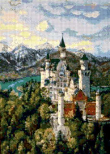 Ориентировочно так, схема вышивки «Средневековый замок», созданная автором Aliko, будет выглядеть при отшиве на канве. Размер данной вышивки равен 136x190 крестов, при этом используется 79 цветов. Ключевые слова, по которым можно найти эту схему: замок, горы, лес, пейзаж, озеро. Также, вы можете взглянуть на оригинальную картинку, соответствующую данной схеме вышивки.