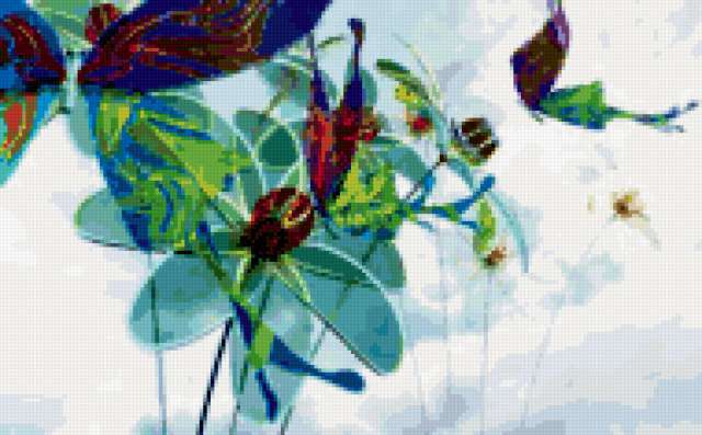 Ориентировочно так, схема вышивки «Стеклянные цветы», созданная автором svobodna-7, будет выглядеть при отшиве на канве. Размер данной вышивки равен 190x118 крестов, при этом используется 76 цветов. Ключевые слова, по которым можно найти эту схему: цветы, буке, стекло, искусство, разное, украшение, букет.красота, картина. Также, вы можете взглянуть на оригинальную картинку, соответствующую данной схеме вышивки.