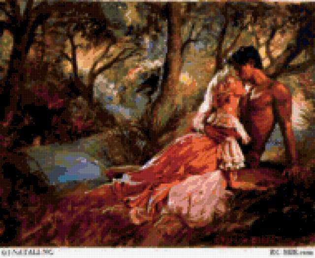 Ориентировочно так, схема вышивки «Страсть», созданная автором olya-lya, будет выглядеть при отшиве на канве. Размер данной вышивки равен 190x156 крестов, при этом используется 67 цветов. Ключевые слова, по которым можно найти эту схему: пара, двое, любовь, страсть. Также, вы можете взглянуть на оригинальную картинку, соответствующую данной схеме вышивки.