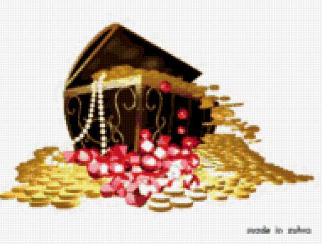 Ориентировочно так, схема вышивки «Сундук с сокровищами», созданная автором EL-Rishe, будет выглядеть при отшиве на канве. Размер данной вышивки равен 190x144 крестов, при этом используется 50 цветов. Ключевые слова, по которым можно найти эту схему: сокровища, деньги, сундук, золото, богатство. Также, вы можете взглянуть на оригинальную картинку, соответствующую данной схеме вышивки.