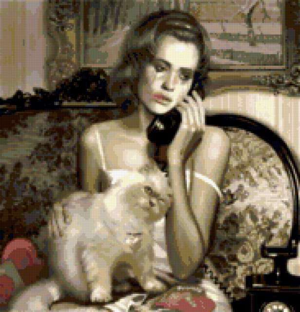Ориентировочно так, схема вышивки «Телефонный звонок», созданная автором rybka6, будет выглядеть при отшиве на канве. Размер данной вышивки равен 183x190 крестов, при этом используется 42 цветов. Ключевые слова, по которым можно найти эту схему: девушка, портрет, телефон, ретро, разговор, кошка, кот, котик, киска. Также, вы можете взглянуть на оригинальную картинку, соответствующую данной схеме вышивки.
