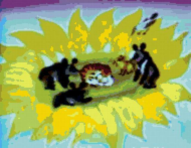 Ориентировочно так, схема вышивки «Тигренок на подсолнухе», созданная автором Melisenta, будет выглядеть при отшиве на канве. Размер данной вышивки равен 190x147 крестов, при этом используется 53 цветов. Ключевые слова, по которым можно найти эту схему: подсолнух, тигренок, тигры, медвежата, медведи, цветок, сказка, детям, мультик. Также, вы можете взглянуть на оригинальную картинку, соответствующую данной схеме вышивки.