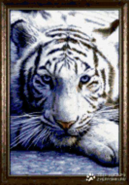 Ориентировочно так, схема вышивки «Тигрик», созданная автором Fefella, будет выглядеть при отшиве на канве. Размер данной вышивки равен 133x190 крестов, при этом используется 54 цветов. Ключевые слова, по которым можно найти эту схему: животные, тигр. Также, вы можете взглянуть на оригинальную картинку, соответствующую данной схеме вышивки.