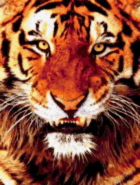 Ориентировочно так, схема вышивки «Тигриный оскал», созданная автором Kukushechka92, будет выглядеть при отшиве на канве. Размер данной вышивки равен 140x185 крестов, при этом используется 67 цветов. Ключевые слова, по которым можно найти эту схему: тигр, животные, кошки. Также, вы можете взглянуть на оригинальную картинку, соответствующую данной схеме вышивки.