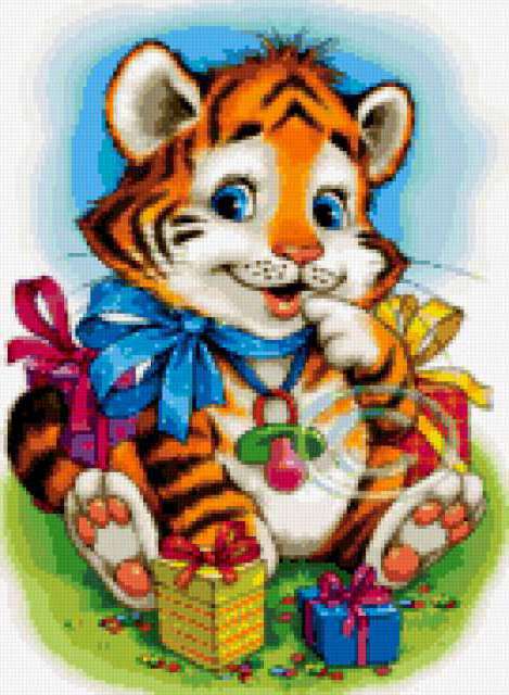 Ориентировочно так, схема вышивки «Тигруля», созданная автором lucha, будет выглядеть при отшиве на канве. Размер данной вышивки равен 135x184 крестов, при этом используется 77 цветов. Ключевые слова, по которым можно найти эту схему: тигры, звери, животные, детское. Также, вы можете взглянуть на оригинальную картинку, соответствующую данной схеме вышивки.